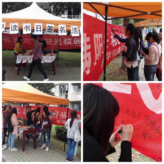 2015年4月23日,英国正版365官方网站读书社在阳光校区一食堂侧门举办“世界读书日”签名活动。同学们在世界读书日签下自己的名字,立志好读书,读好书,并向其他同学宣传读书好。活动引起广泛关注,一位职工也在横幅上签名表示支持。